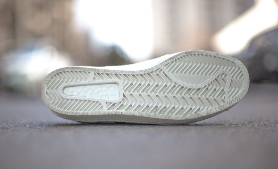 在经典复古鞋型的外观之下,巧妙融入 Boost 全掌中底,外底采用了同 Yeezy Boost 一样的后跟三角形曝露方式。在内侧足弓处,一块 Boost 材质暴露在外,也许你会对这个扎眼的“口香糖”嗤之以鼻,但从另个维度来看,这正是彰显它独特的性格与变革基因。