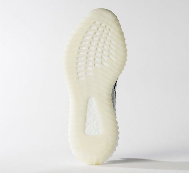 乳白色的鞋底托衬,Primeknit 编织鞋面也以白色作为背景,辅以黑色条纹营造斑马纹理。鞋身侧边依然是红色的 SPLY-350 字样呈现,后跟鞋提也同样回归。