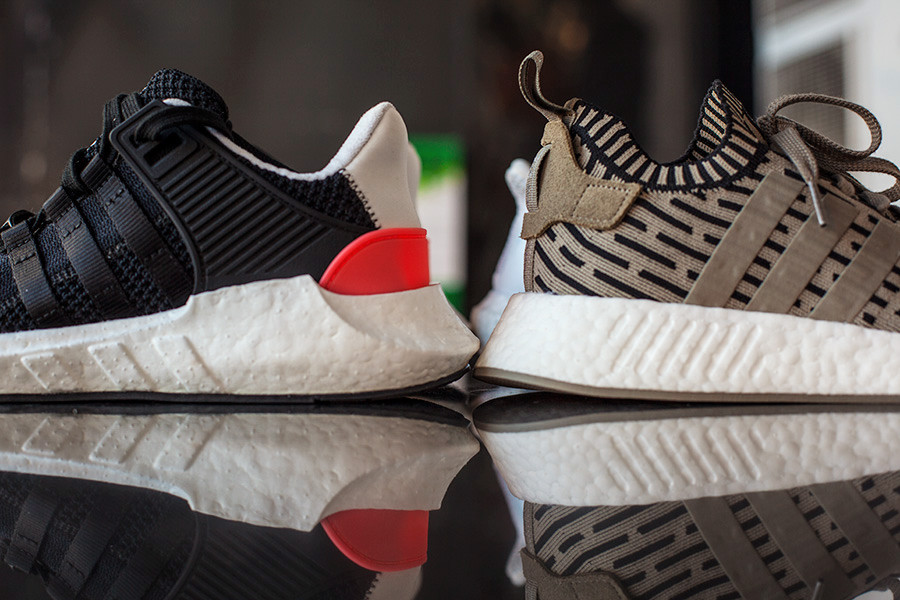 adidas Originals NMD 和 adidas Originals EQT Support 93/17 的 Boost 的对比图。