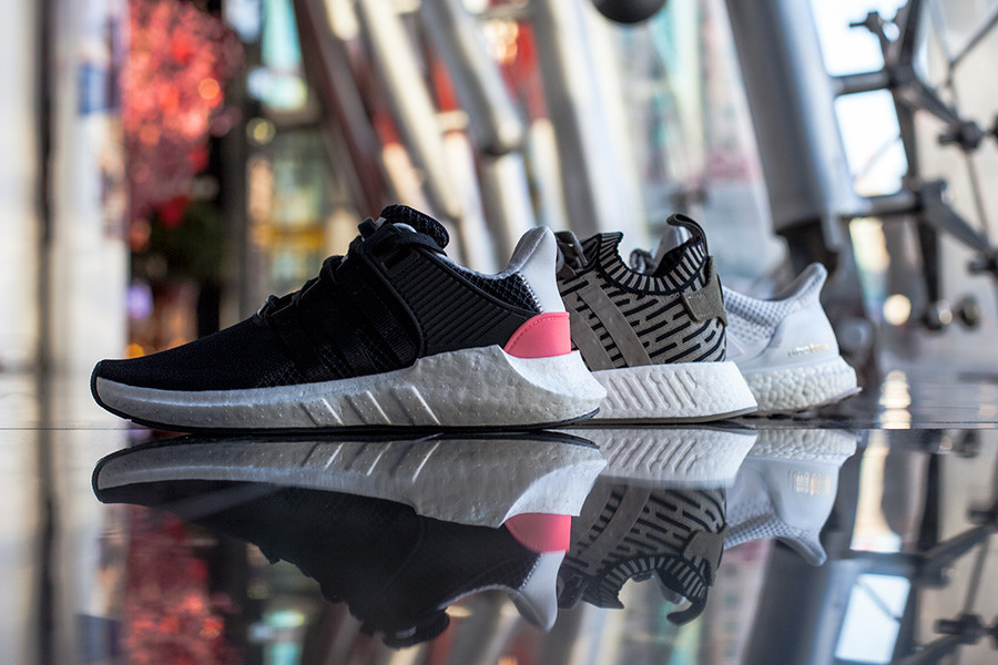 adidas Ultra Boost 2.0 和 adidas Originals EQT Support 93/17 的 Boost 的对比图。