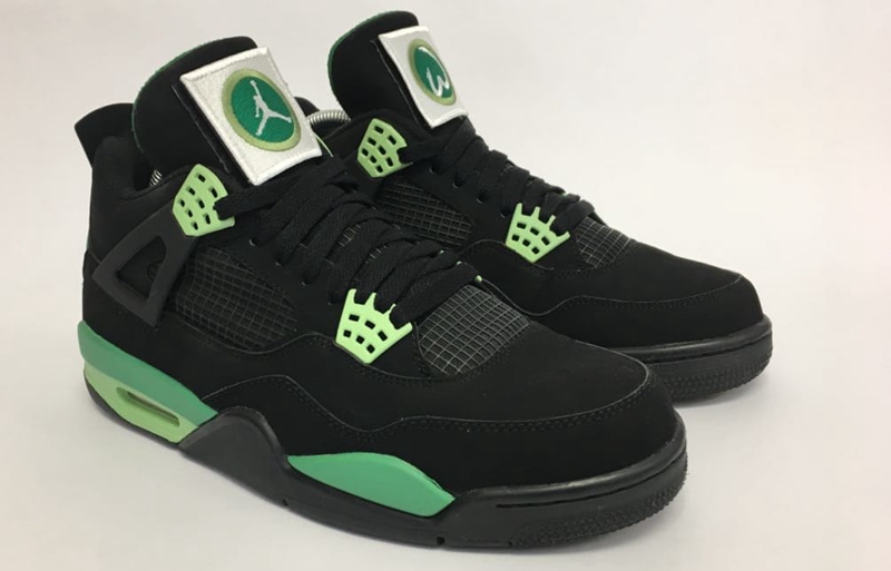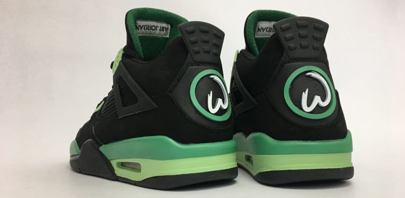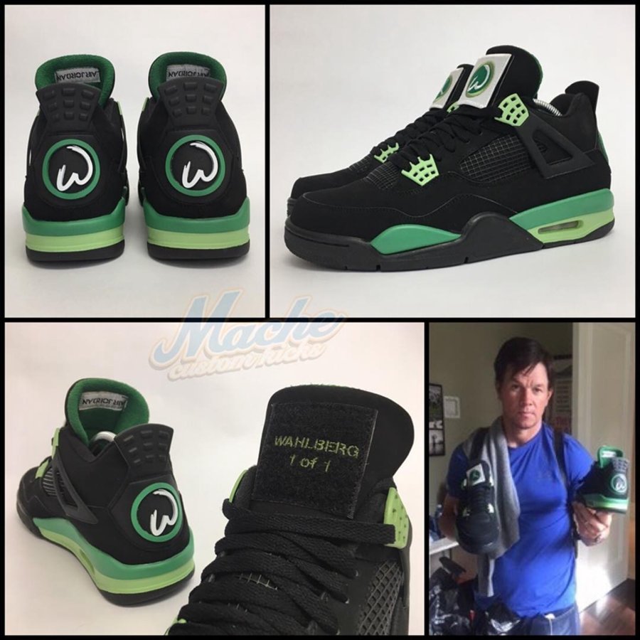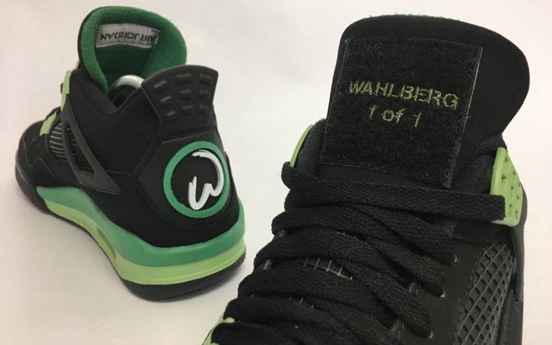 鞋身采用黑色磨砂皮革为主色,点缀深浅绿色带来清爽的视觉表现。AJ4 标志性的方形鞋舌贴布将时下流行的魔术贴以 Jumpman Logo 和沃尔伯格专属 Logo 呈现,撕下魔术贴后,Wahlberg 1 of 1 凸显本次定制的专属身份。