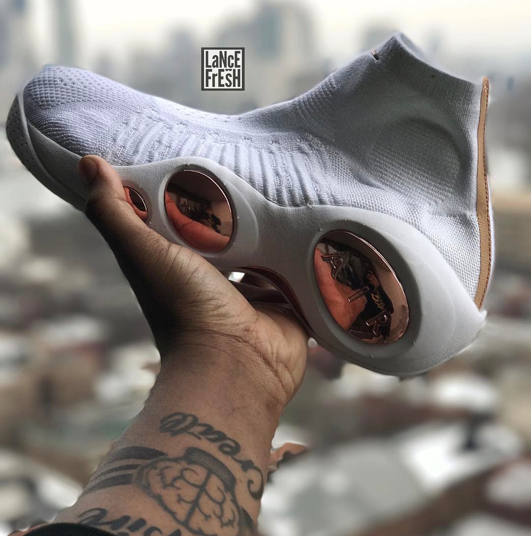 今日,身为保罗乔治的好兄弟设计师 @lancefresh,在个人 Instagram 上展示出这双 Nike Bonafide,并进行上脚试穿。这款球鞋以彰显现代科技的 Flyknit 织物鞋面搭配高筒拉链袜身亮相,一席纯白包裹之下,Zoom Flight 95 标志性的“大眼睛”中底被再度启用,着实让人兴奋不已。