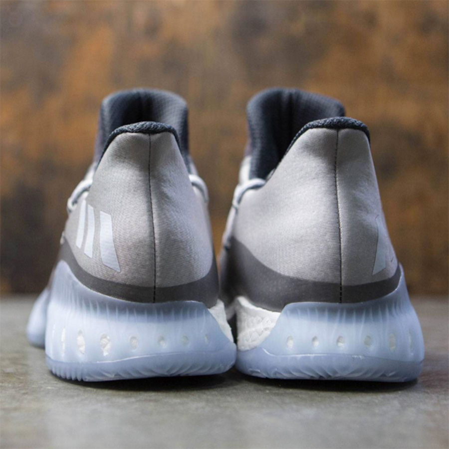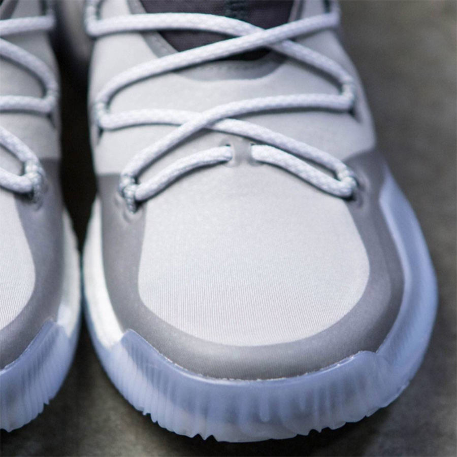 除了我们报道的 CrazyExplosive Low 红白配色,眼前的这款 CrazyExplosive Low “Cool Grey” 则以清爽的酷灰装扮呈现,依然是全掌 Boost 中底加持,不过鞋面并没有采用 Primeknit 编织材质,而是以一体化的 Mesh 工程面料打造。