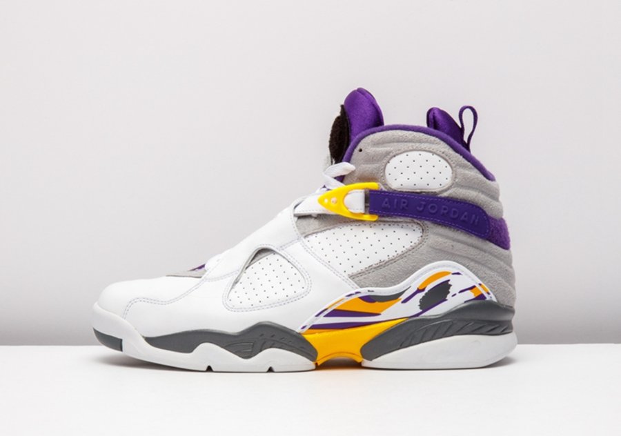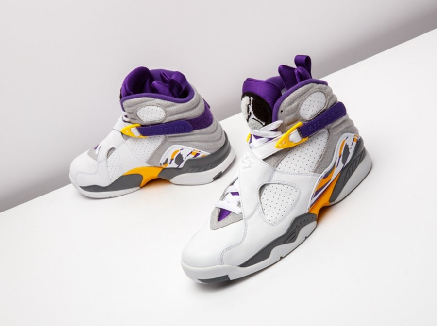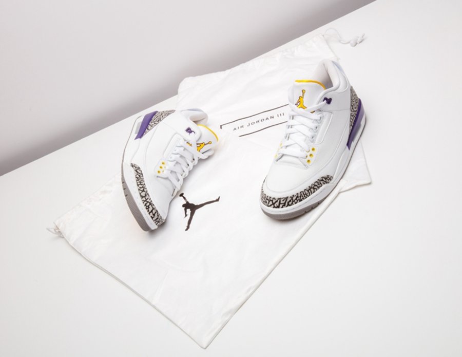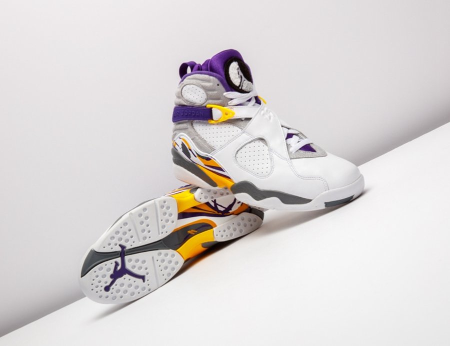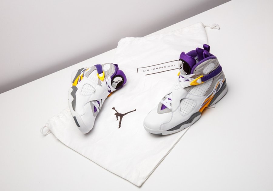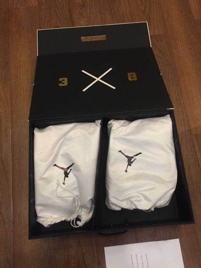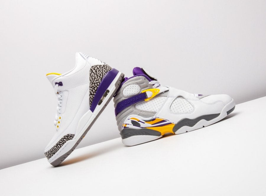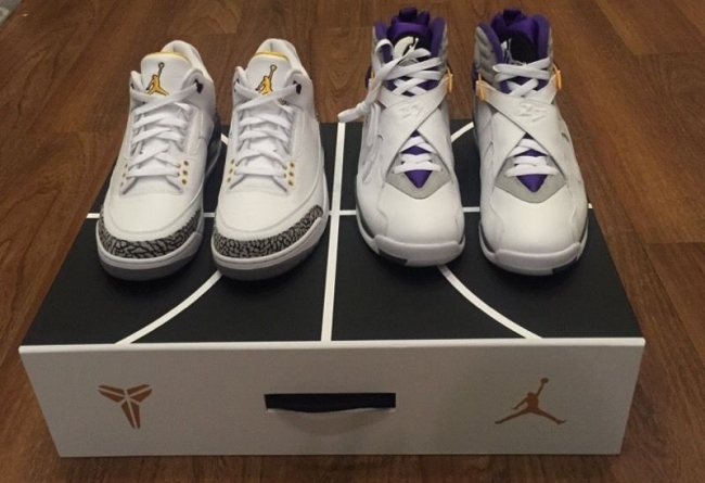 这套湖人配色 Air Jordan 3/8 曾被科比本人在离开 adidas 后的乱穿鞋时期上脚,随后 Nike 将其制成套装赠予飞侠,从未市售。