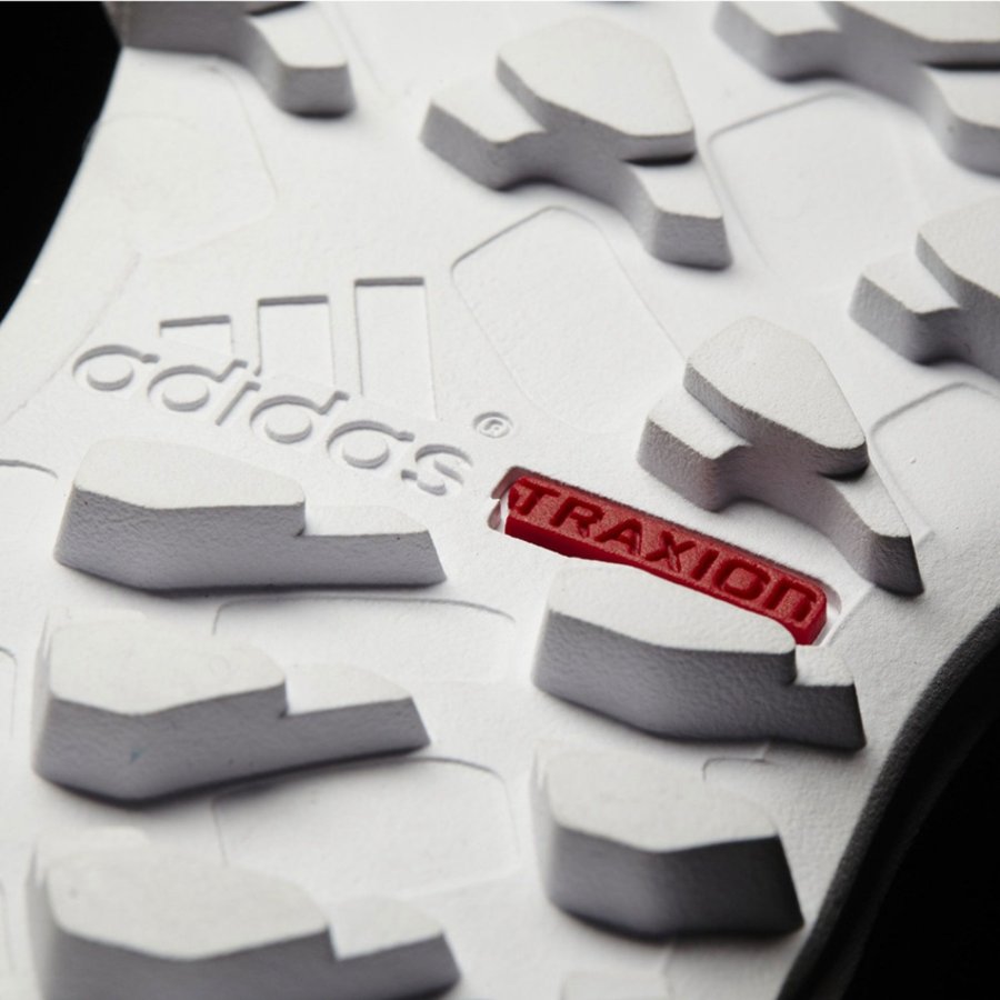 Traxion - 奇钉技术。adidas 根据人体工程学原理,设计出一种纵横交错大小不一的外底技术。不仅提高了鞋和地表的接触面积,更增加了摩擦力、舒适性及安全度。常被才用到户外鞋和足球鞋的生产之中。