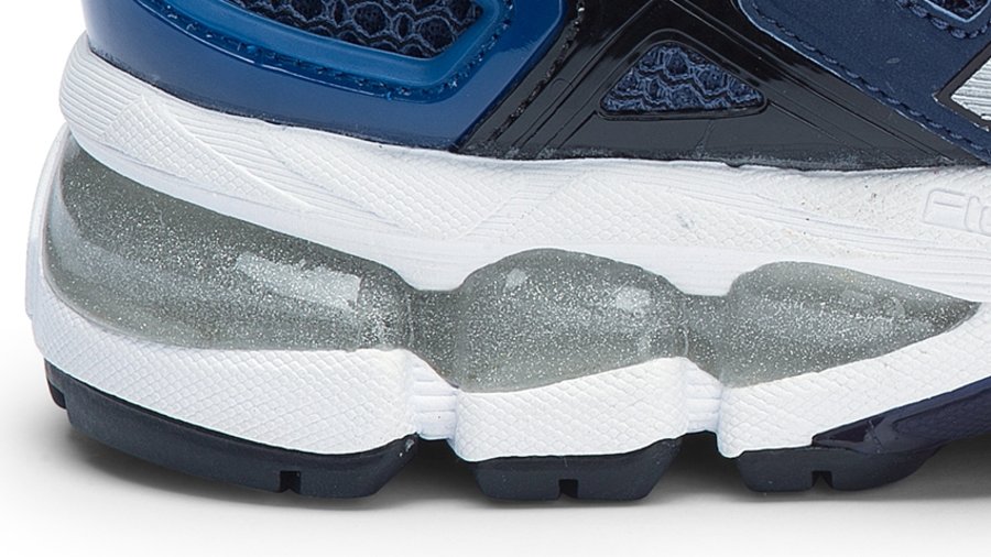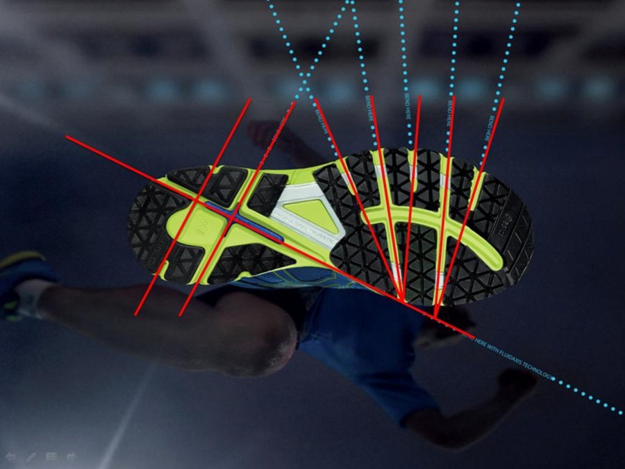 Flex grooves - 弯曲凹槽。位于前掌,用来提高前掌的弯曲度,极大多数运动鞋外底都具有弯曲凹槽设计。