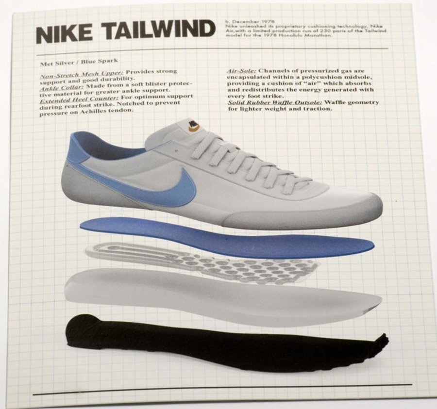 Air Sole - 问世于 1979 年的 Air Sole 是 Nike Air 的最初形式,以高压方式将 Nike Air 气体灌入一个坚韧的合成橡胶层内而成,将其置于中底之中,从而达到缓震的目的。Nike Air Tailwind 是第一双带有 Nike Air 气垫的运动鞋。