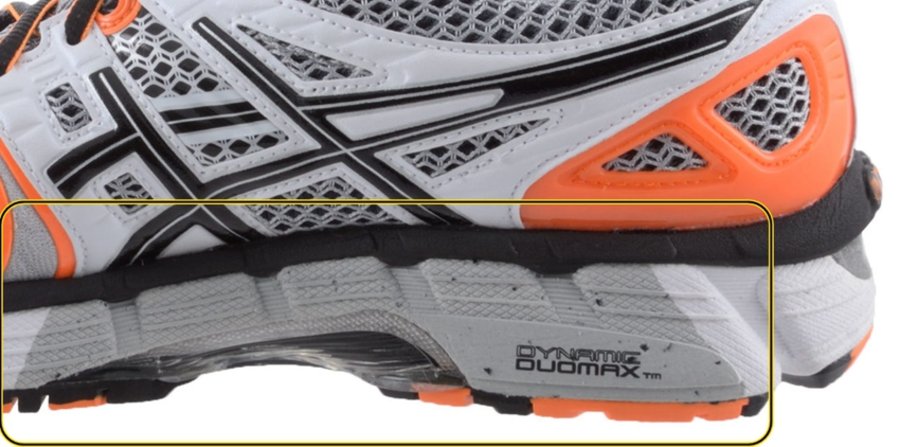 DuoMax Support System - 防倾斜装置。ASICS 研发的一种双重密度中底。常用于稳定系和支撑系跑鞋之中。有效防止双脚过度侧倾所带来的危害,并可纠正跑姿。