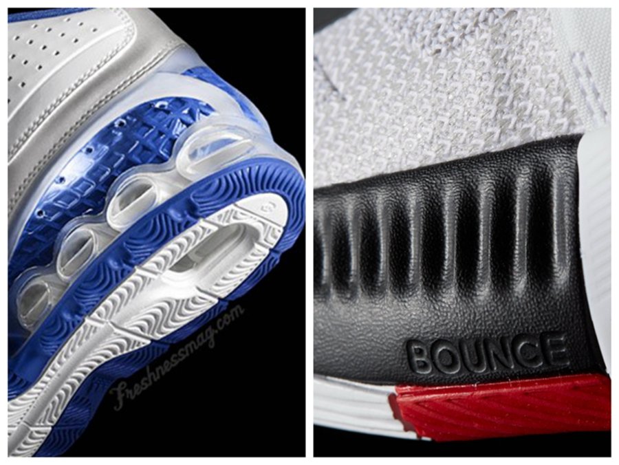 Bounce - 早期 adidas Bounce 采用 θ型结构的 TPU 中底来进行缓震及回弹,代表鞋款有加内特的 adidas Bounce Garnett 07 和 TS Bounce Commander 等。近些年 Bounce 一改往日霸气的外观,进化成中底 EVA 缓震材料,代表鞋款为利拉德的全新战靴 Dame3。