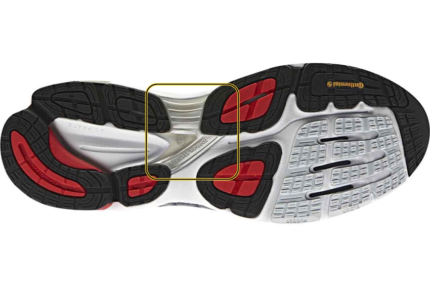 Torsion System - 扭转系统作为 adidas 基础科技之一,Torsion System 将热塑性 TPU 打造成“Y”、“V”、“X” 及 “3D” 等多种形状,自身具有刚性及韧性的特点,能良好的牵引足弓与前后掌的鞋底,防止运动过程中扭伤的发生。
