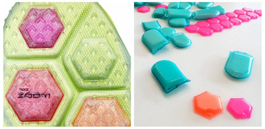 Thermo Plastic Urethane(TPU) - 热电塑料聚氨酯橡胶,能够在一定热度下反复变软的可塑塑胶材料,在塑形后的常温下,具有坚韧牢固的特性,常被置于球鞋需要保护的部位。