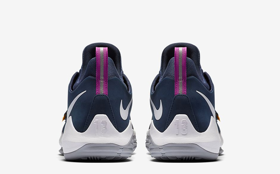 采用了深蓝色作为主题,细节以黄色点缀,浓浓的步行者气息。与首发配色不同,这双 PG 1 “Ferocity” 不仅在视觉上以白色鞋底和 Swoosh 点亮整体,外底则采用了 XDR 材质,更为耐磨。