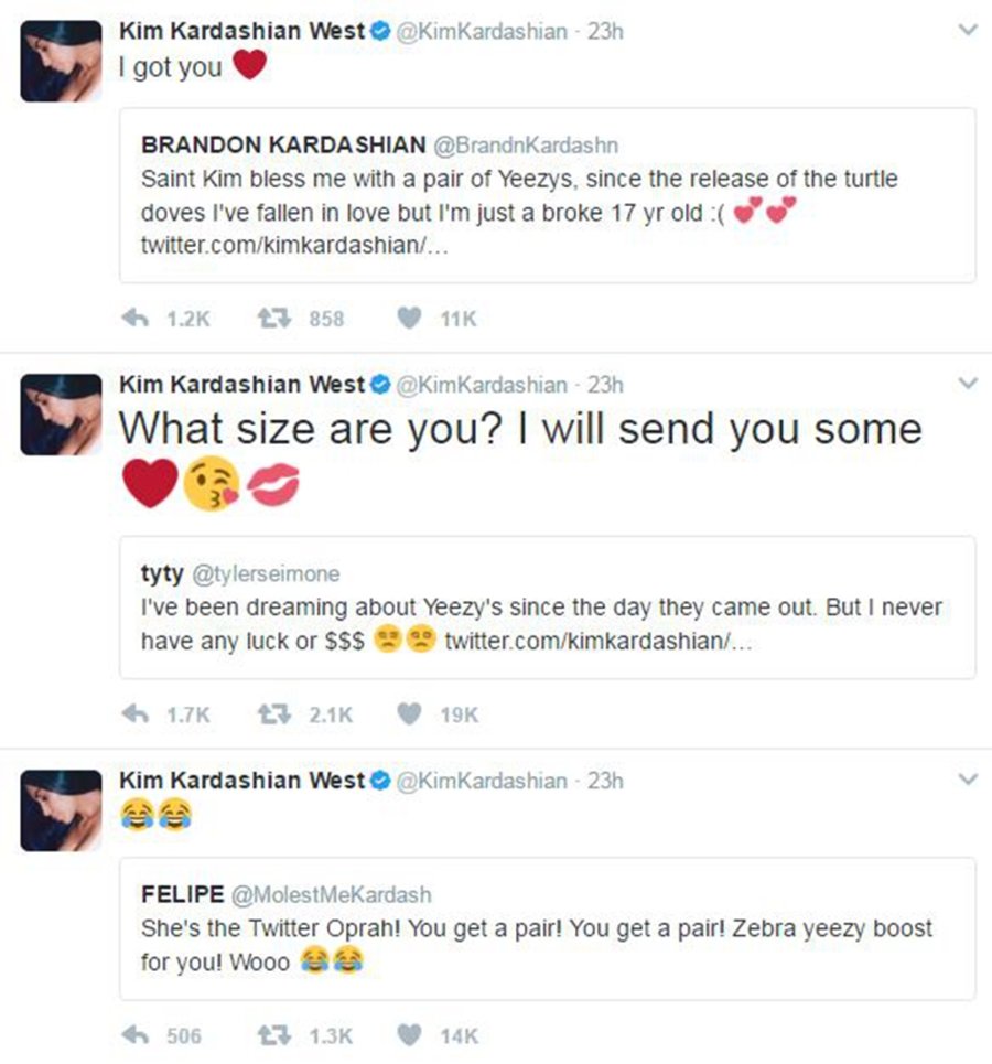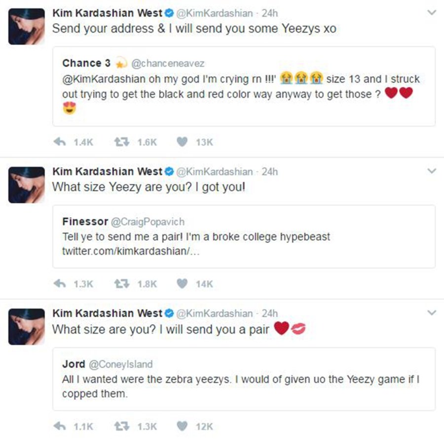 而随着鞋款的发售,大批粉丝想必的同小编一样毫无悬念的做了分母,甚至连登记的资格都没有。近日有网友在大姨子的个人推特下方留言,表达对“白斑马”的渴望,万万没想到收到了卡戴珊本人的回复,甚至亲自询问尺码和地址,答应送些 Yeezy 给幸运网友。