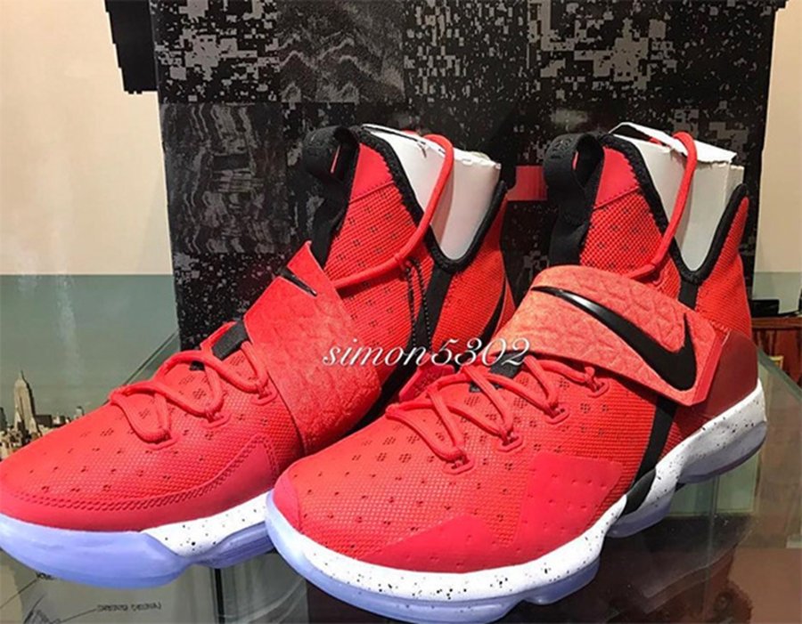 詹姆斯在 2 月 14 日的对阵掘金的比赛中,上脚一款全新的 LeBron 14 PE “University Red”。