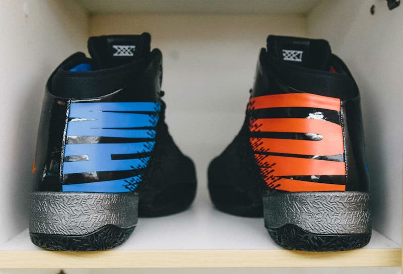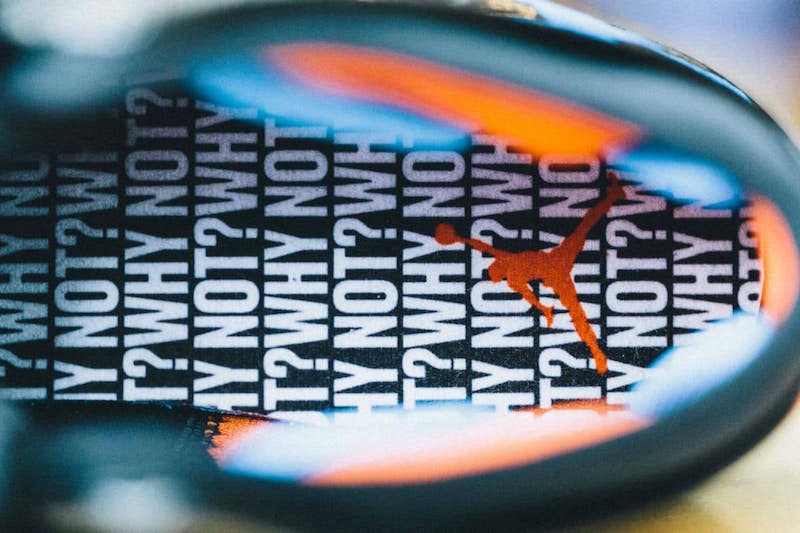 该款 Air Jordan 30.5 以黑色为主色调,左右脚细节采用蓝橙的鸳鸯搭配,鞋帮内测还印有 “Why Not” 字样。