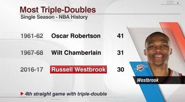 目前本赛季已经拿下 30 次三双,超越乔丹的 28 次,成为 NBA 历史第三人,并极有可能超越 NBA 名宿张伯伦 31 次和大 O 罗伯特森 41 次。目前职业生涯 67 次三双,被粉丝们称为 Mr.Triple-Double。