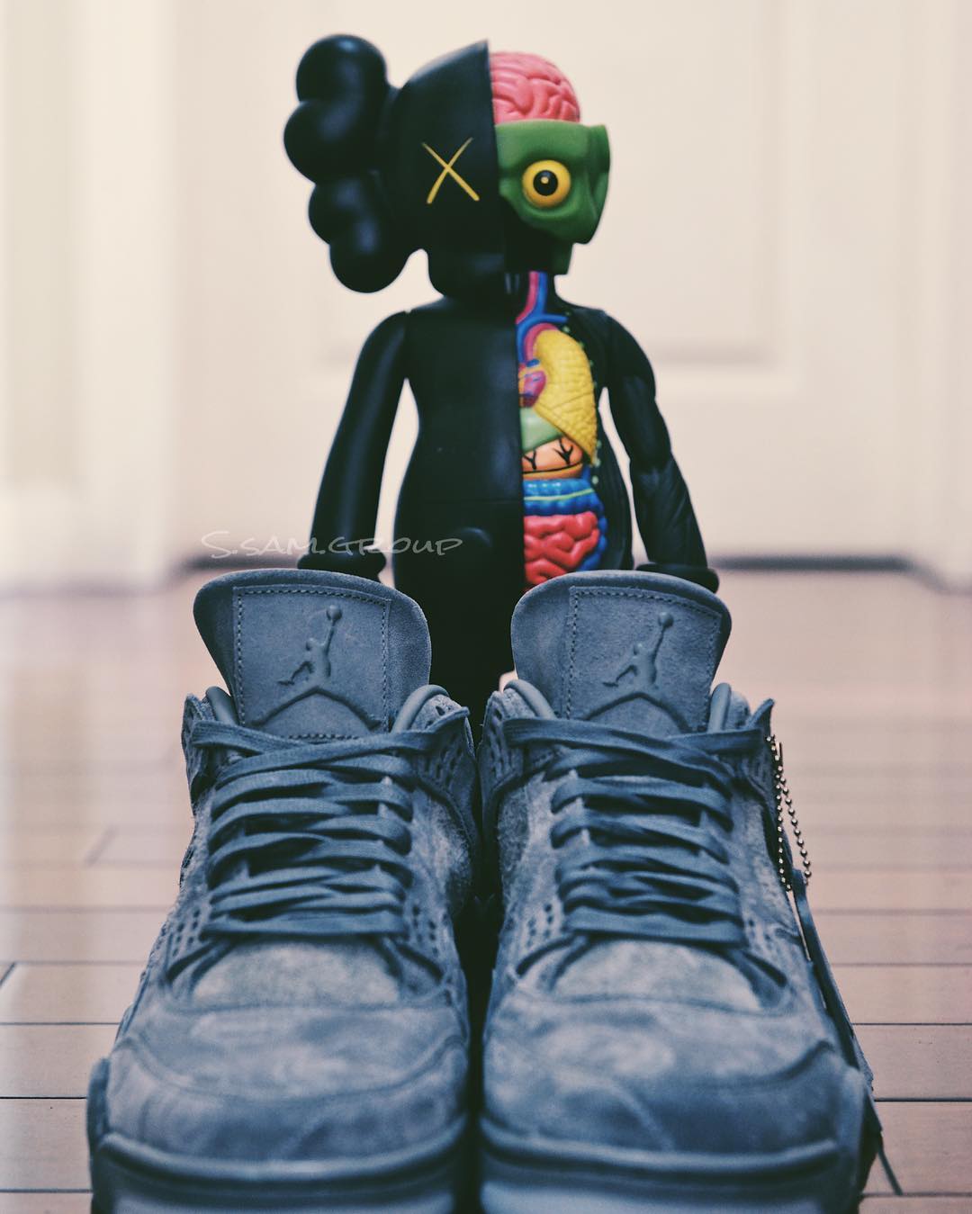 而这双 KAWS x Air Jordan 4 不仅有着经典 XX 元素的加持,精美的细节,以及麂皮材质的华丽质感,还有夜光外底!都让观众情不自禁想要收入囊中!