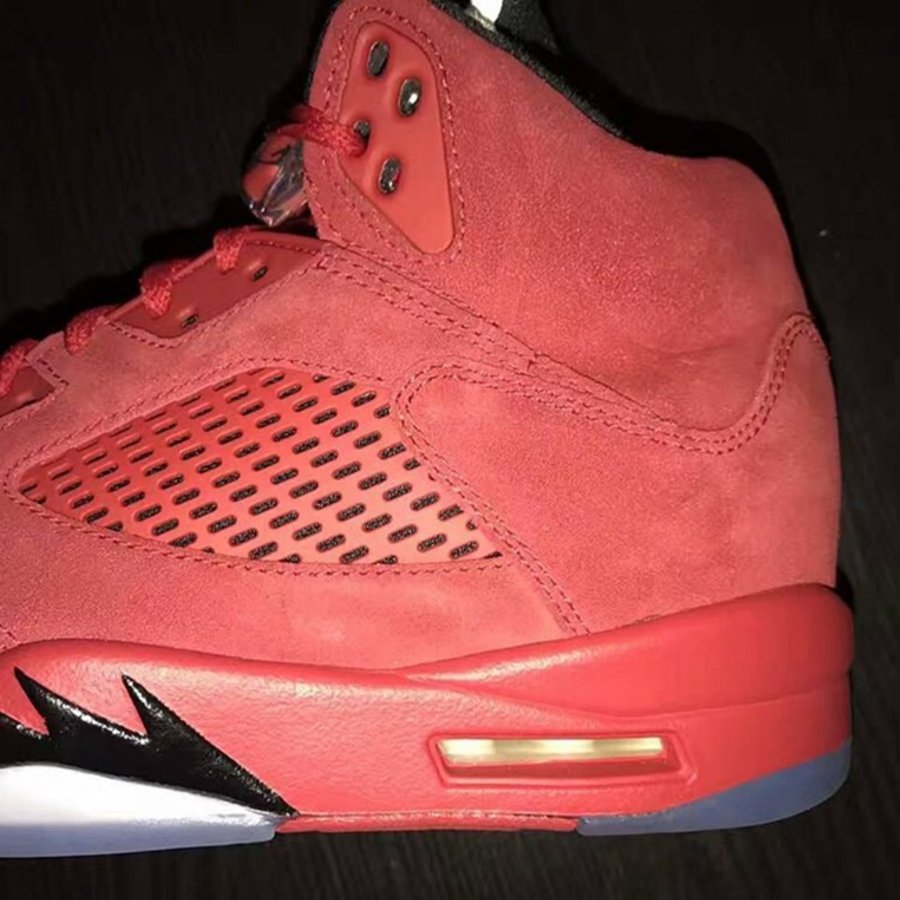 眼前这双 Air Jordan 5 “Red Suede” 采用鲜红色牛巴革鞋身辅以 3M 反光鞋舌重现当年风采,而中底标志性的鲨鱼战机涂装则以黑色纹理呈现。中底涂装及鞋带细节与当年有所不同,呈现出更为艳丽奔放的视觉冲击!两者相比之下,不知你更倾心于哪双?