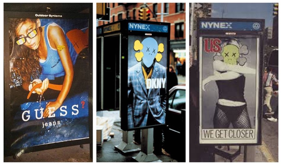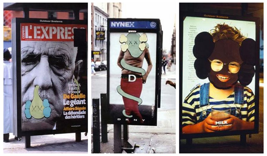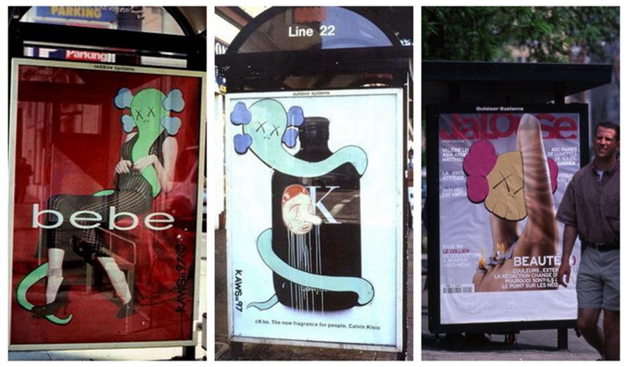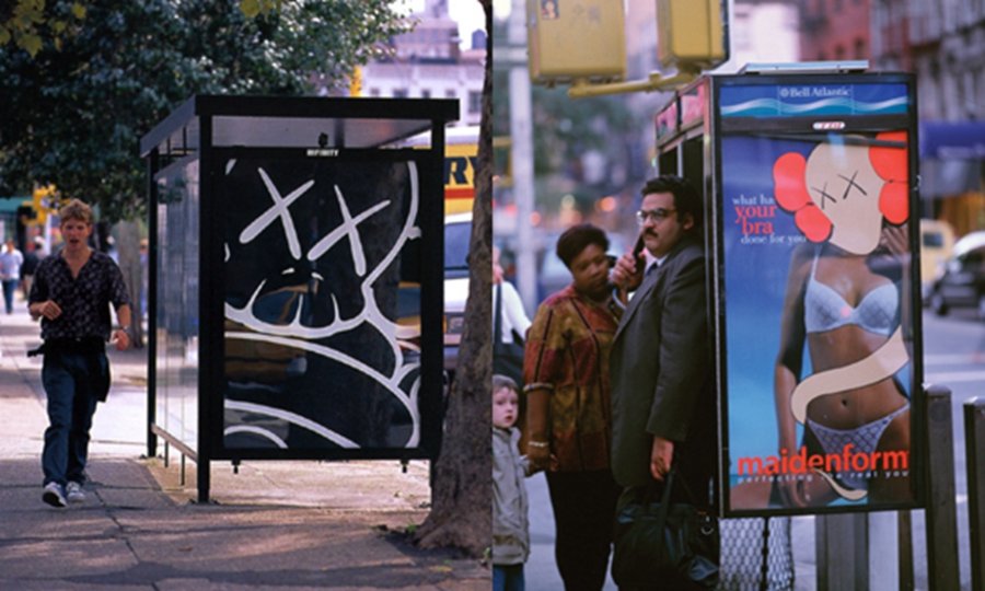 身在异乡,不甘平凡的 KAWS 在好友 Barry Mcgee 的协助下,学会了打开巴士站、电话亭等广告牌橱窗的办法,随后 KAWS 便开始偷偷将橱窗中的广告海报“运”回工作室,经过一番精心的设计再悄悄放回原位。