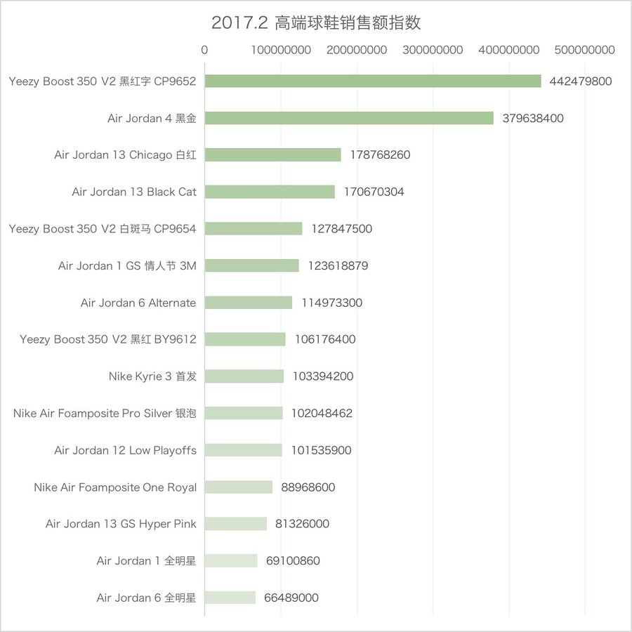 根据 SneakerMarketWatch.com 发布了 2017 年 1、2 月份的球鞋售卖数据,从销量和销售额的排行上可以看出,一月销售量最高的是 Nike Kyrie 3 首发配色,而销售额最高的是 Yeezy Boost 350 V2 黑白。二月销售量最高的是黑金配色的 Air Jordan 4,销售额最高的依然还是 Yeezy 350 V2,只是配色改为了黑红字。虽然 Nike 的销量高,可是依然抵不过 Yeezy Boost 350 V2 的售卖价格高,只能频频让出销售额榜单第一的位置。