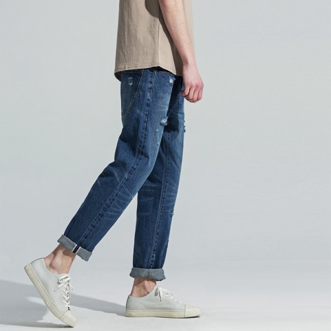 经典的蓝色牛仔布料呈现,星星点点的破洞细节,在率性随意之余又带来了不单调的穿搭感觉。小脚收口设计,突出球鞋和脚踝。