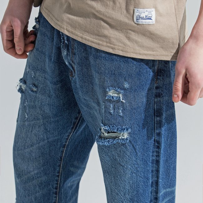 蓝色单宁布料打造破洞风格牛仔裤,复古风范之下又以细节装饰丰富了视觉层次。