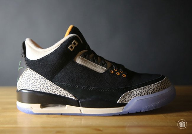 近期,已有大神提前入手该套装,并在网上晒出 Air Jordan 3 “atmos” 的上脚图片。Air Jordan 3 以黑色磨砂皮革搭配 Safari 石斑纹理点缀,冰蓝水晶大底与橘黄色内衬均流露出当年 Air Max 1 “Safari” 熟悉的身影。后跟 Nike Air 再次出现,也与 Air Max 1 后跟相呼应,重温上世纪 80 年代的那份古典情怀!