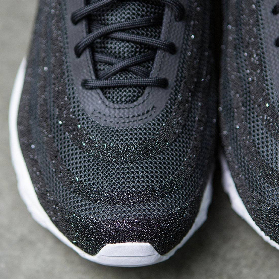 看起来简约的黑白搭配,鞋面则暗藏了炫目细节!巧妙的运用了 Air Max 97 的鞋面条纹设计,以施华洛世奇水晶成条状覆盖,在角度和光线变化之间,星光熠熠的璀璨效果,着实让人着迷!