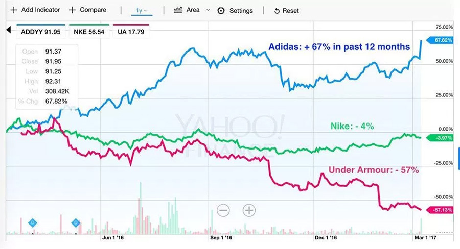 Nike 不断提升款式、货量和发售频次,另外一个重要原因也是因为 adidas 的全面崛起。