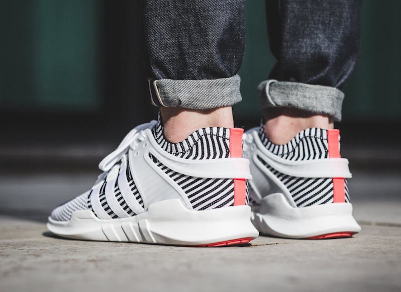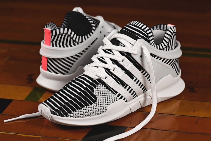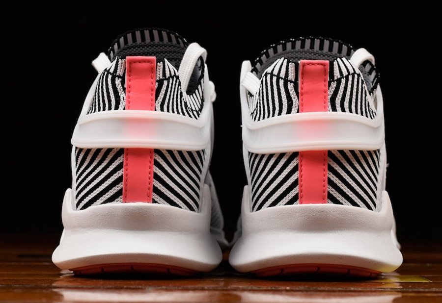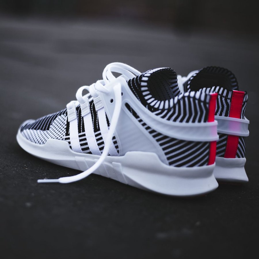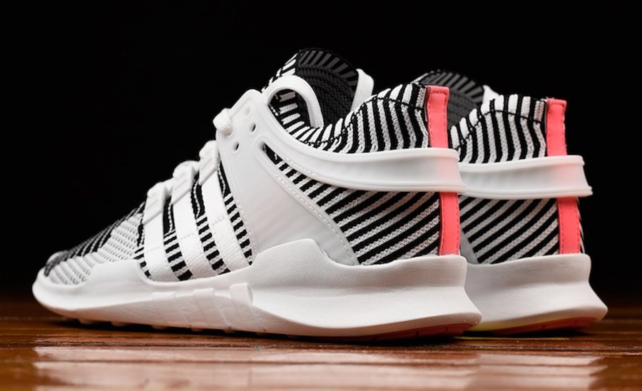 这款全新的 adidas EQT Support ADV 搭载了 adidas 的 Primeknit 织物鞋面,并配以黑白相间的斑马纹路,十分吸睛,鞋外侧的经典三道杠与后跟支架均采用纯白色,袜套式的鞋身成为最大亮点,后跟一抹粉色非常清新,也为这双鞋起到画龙点睛的作用。