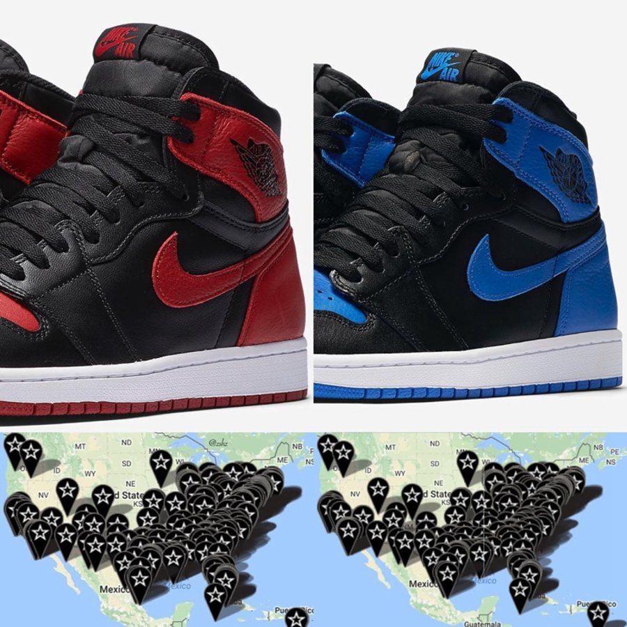 这双黑蓝 Air Jordan 1 “Royal” 已经确定将于今年 4 月 1 日愚人节发售,目前美国地区 Footaction 连锁店铺的发售地图已经释出,对于去年的黑红,可以看出两者的货量几乎一致!