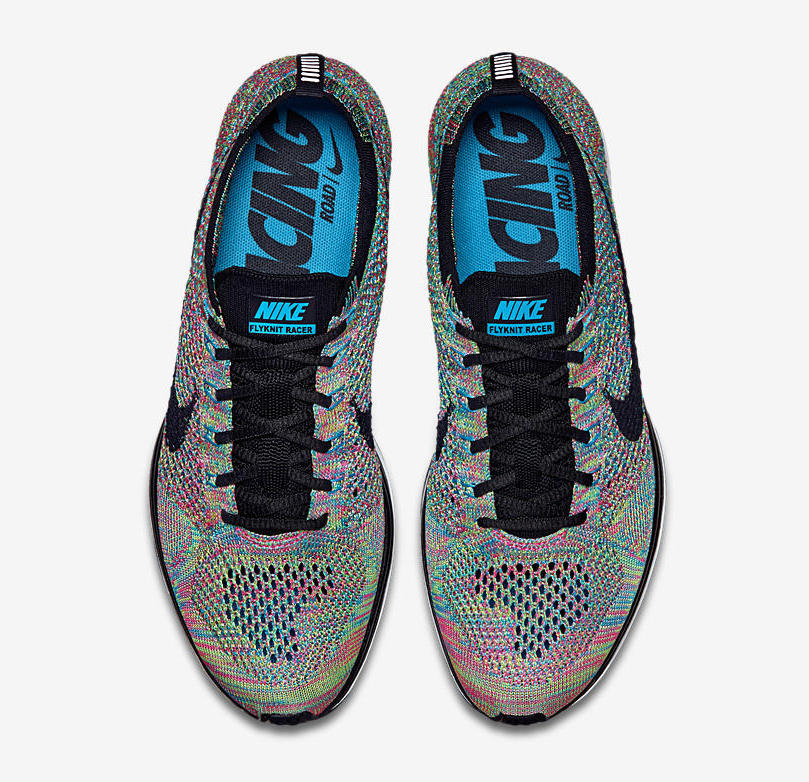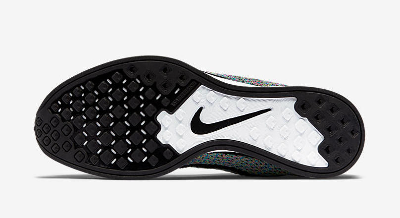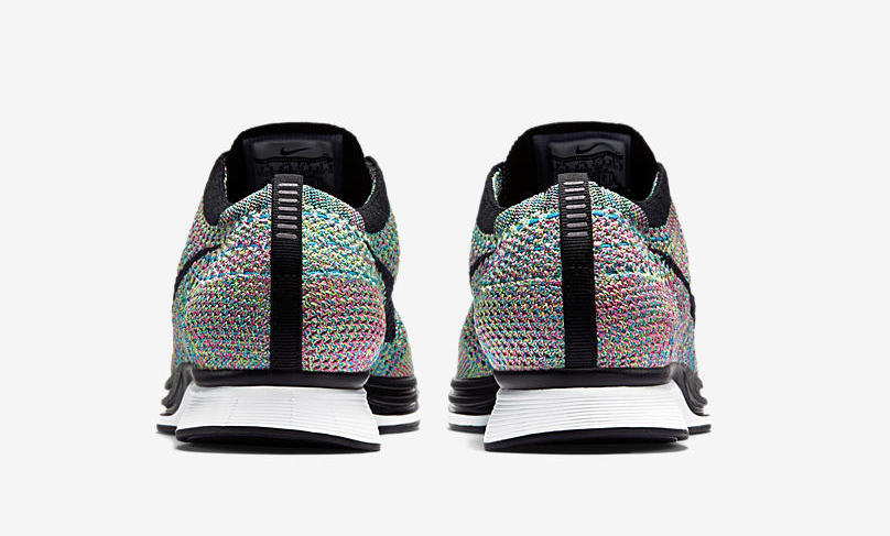 这次的 Nike Flyknit Racer “Multicolor” 采用了黑色的鞋舌,同上一次复刻的灰色鞋舌并不相同,而与再之前的经典款式保持了一致!而鞋面依然是缤纷夺目的彩虹编织,精美细腻的视觉感受,无论是静赏还是上脚,都有独特的冲击力!