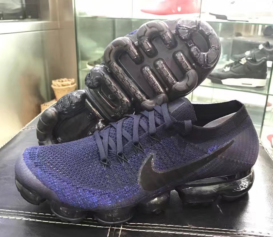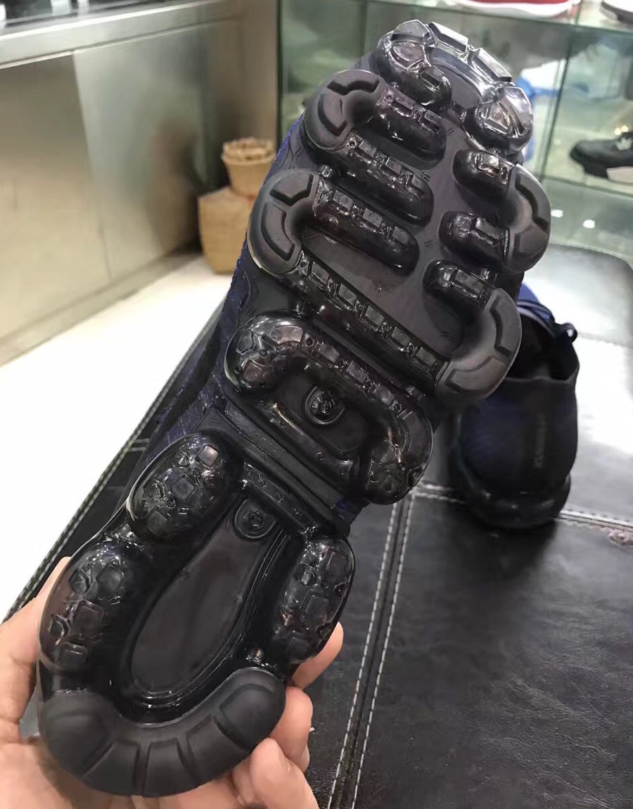 有人认为 Nike Air VaporMax 的首发颜色太浅,很容易蹭脏又不好清洗。眼前这双全新的 VaporMax 鞋面,鞋面采用了深色耐穿的海军蓝色,鞋身细节与气垫大底则则采用黑色渲染。