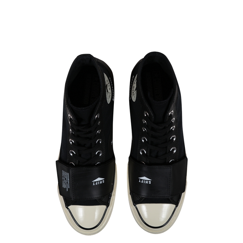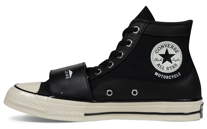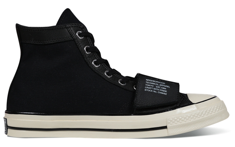 其中 Chuck’70 采用帆布材质制作鞋面,细节处则辅以皮革点缀。最大的亮点在于鞋头处印有 “SHIFT” 字样的魔术贴设计,呼应了 Neighborhood 品牌机车文化 “Gear Shift” 概念,最后搭配油亮的鞋围条及鞋头收尾,硬汉气概十足!