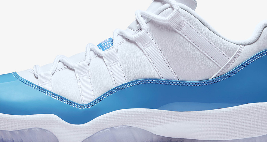 Air Jordan 11 Low “UNC” 以白蓝双色搭配,在彰显活力气质的同时,也提升了材质用料的档次,鞋领改以皮革打造,整体的精致奢华指数也得以进一步提升!
