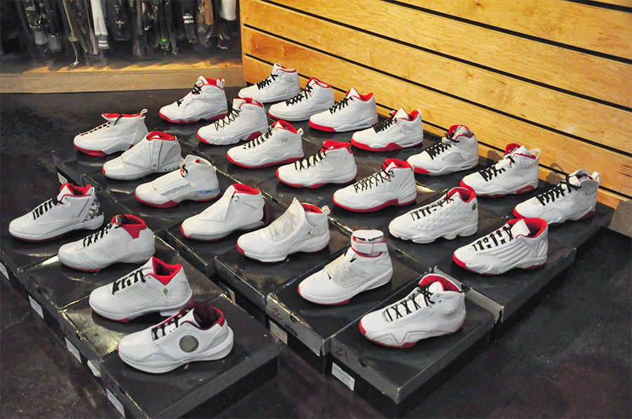 经常逛 Jordan Brand 旗舰店铺的朋友或许经常见到,在店内会陈列这样一组纯白鞋身,细节辅以红色装点的 Air Jordan 全系列球鞋,比如之前的北京欧美汇、广州旗舰店就有展示。
