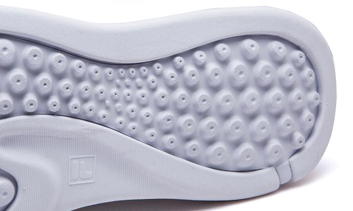 采用双重密度框架式中底,配合微弹簧缓冲技术,在兼顾安全及稳定性的同时,脚掌的核心区域通过若干小气室连通作用,起到实时的流动缓震,犹如踩到水球上一般。