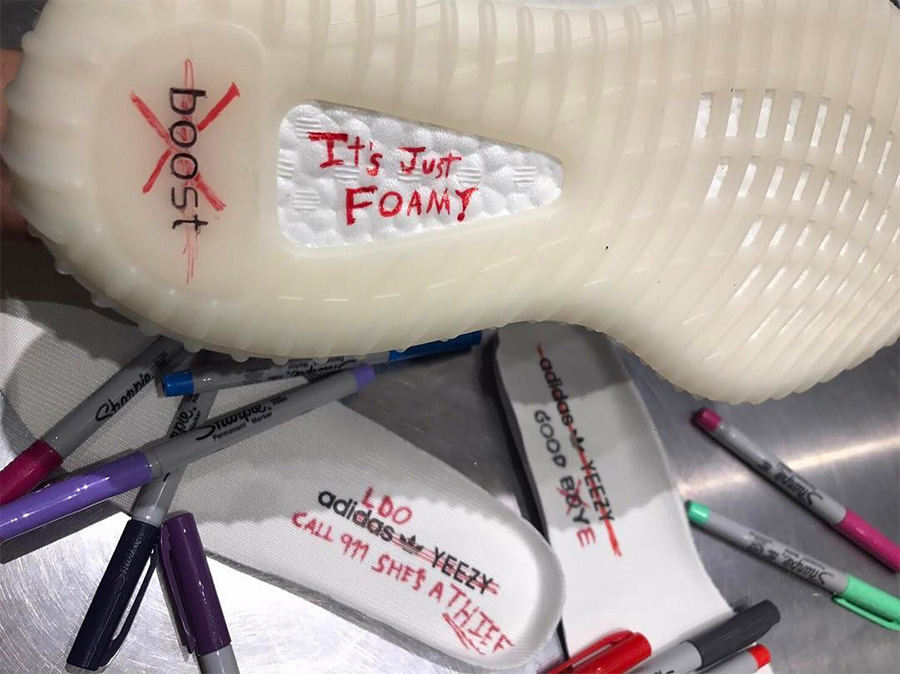 IG 用户 mathabeam 则发挥了自己的绘画动手能力,以多彩水笔在纯白鞋身上画上了诸多潮流元素,可以看到 KAWS、BAPE 等经典图案都有现身,并且鞋垫和鞋底的 Boost 上都有趣味文字涂鸦,不羁的个性彰显无疑!