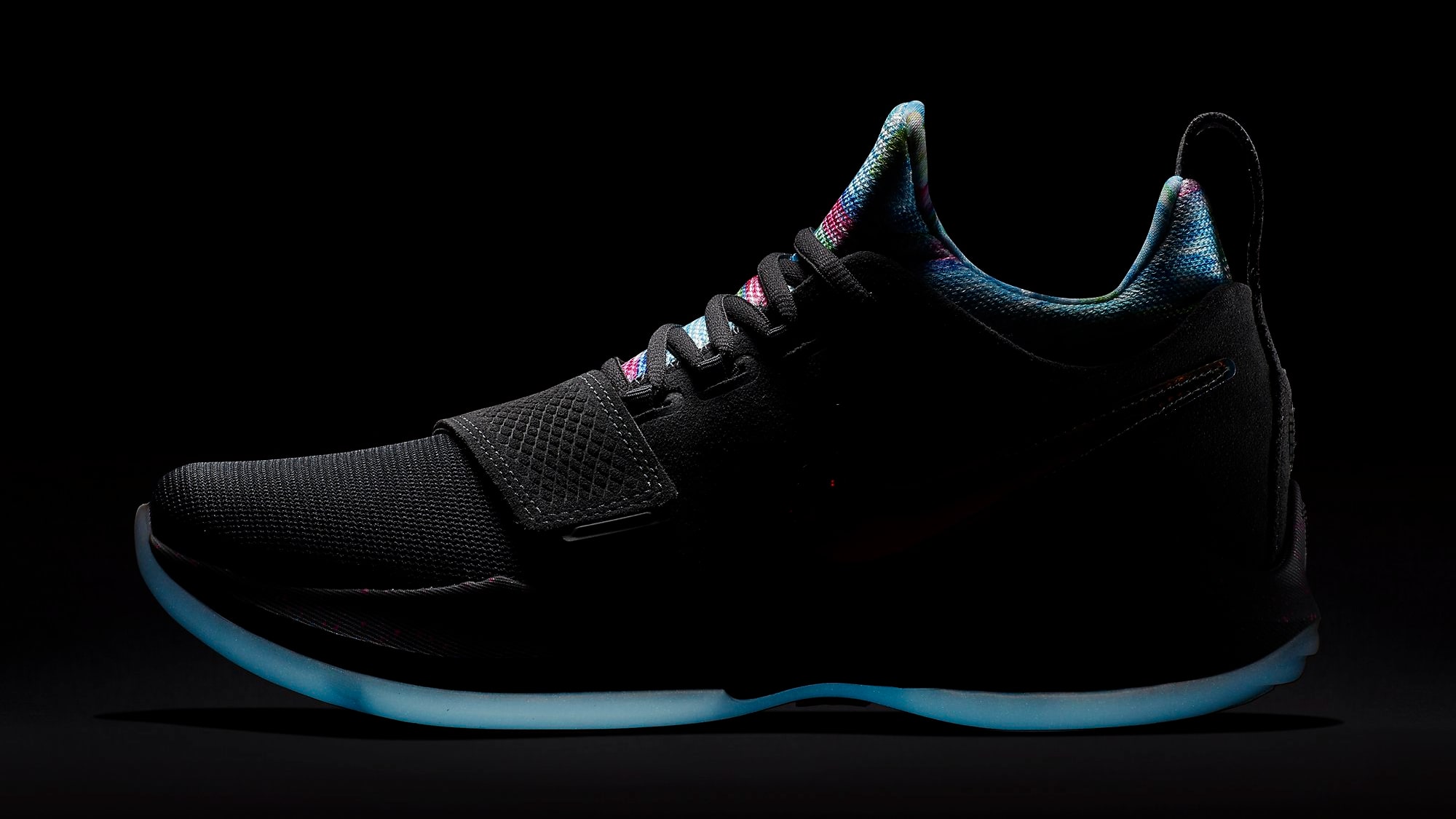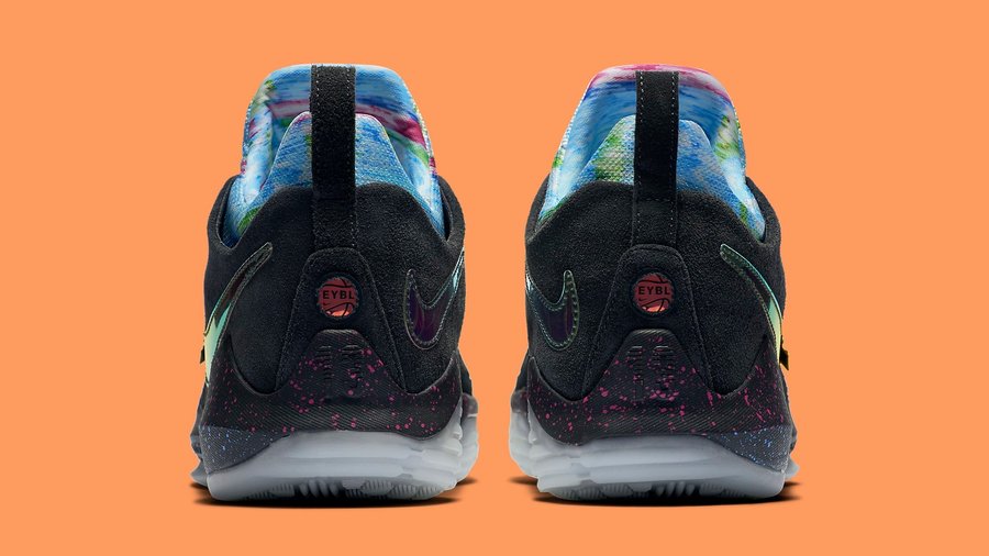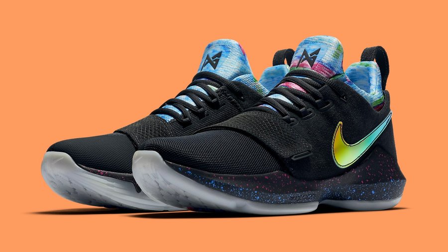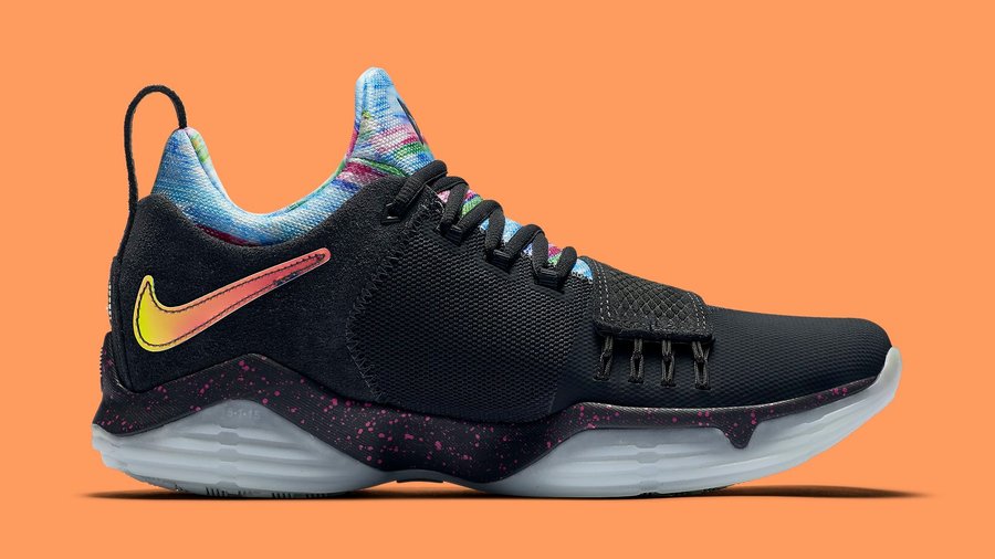 PG 1 EYBL 可称之为目前为止色彩最丰富艳丽的版本了。以黑色为整款鞋的主色调,内靴则由蓝粉相间的条纹搭配其中,辅以金属炫彩的 Swoosh 置于鞋侧,而中底则采用亮眼的蓝粉泼墨呈现。整款鞋色彩十分炫彩亮眼,吸睛度十足。