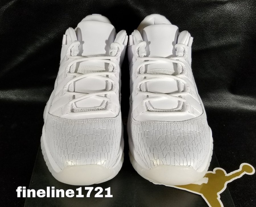 清新淡雅的纯白色调贯穿鞋身,采用近似蛇皮的爆裂纹理替代 AJ11 经典的漆皮轮廓,隐约散发珠光色彩,辅以优质皮革呈现的鞋舌及内衬,营造出高规格的质感表现。最后搭载白色中底及半透明水晶外底,整体造型颇为独特,个性十足!
