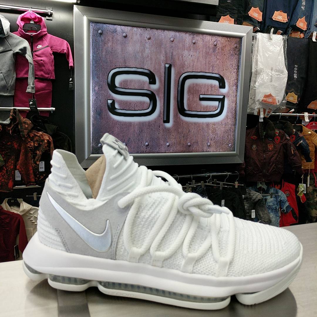目前 Nike KD10 现已曝光,鞋身采用纯白色 Flyknit 编织而成,后跟稳定架运用灰色麂皮材质,Nike Swoosh 和 KD Logo 均采用金属质感的银色进行点缀,鞋身整体造型完全符合 Nike 推出的 “纯白当道” 主题。超粗的鞋带设计可以更好的增加球鞋的包裹感,全掌的 Zoom 设计与 KD9 几乎一摸一样,不知道其中的细节是否会有改变!