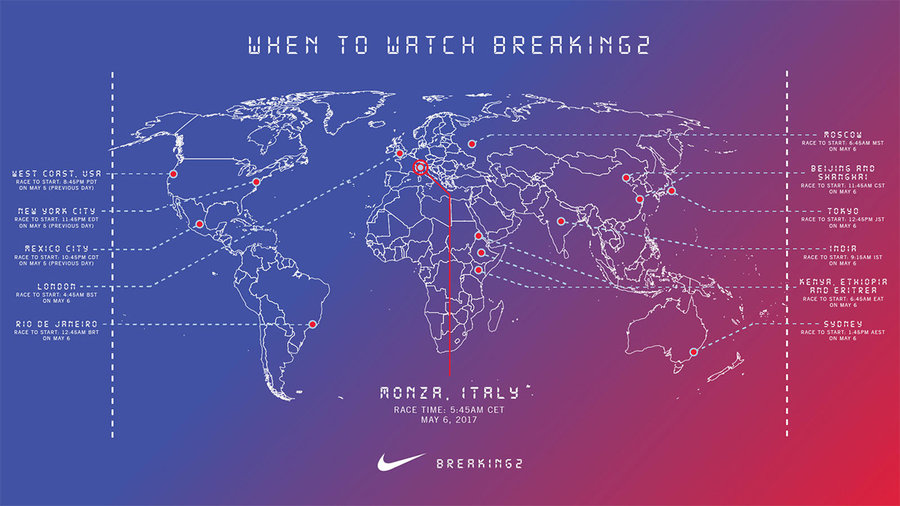 Kipchoge)、勒利萨·德西萨(Lelisa Desisa)以及泽森内·塔德塞(Zersenay Tadese)将在意大利蒙扎进行打破马拉松 2 小时大关的正式挑战。此次正式挑战不对公众开放,但可以通过 Nike 的网络直播来一起见证人类突破极限的大胆尝试,目睹 Breaking2 团队如何直面对于人类潜能的解锁和巨大挑战。