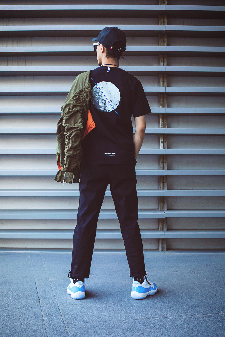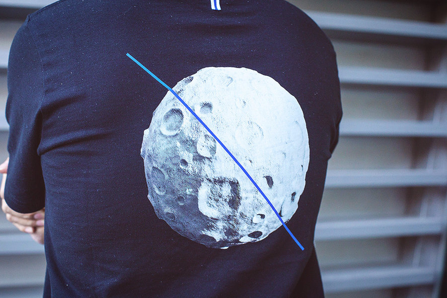 后背有月球数码印花的 Tee,小编的最爱!极为清晰和逼真,面料也立挺垂坠,亲肤感受十分的舒适。