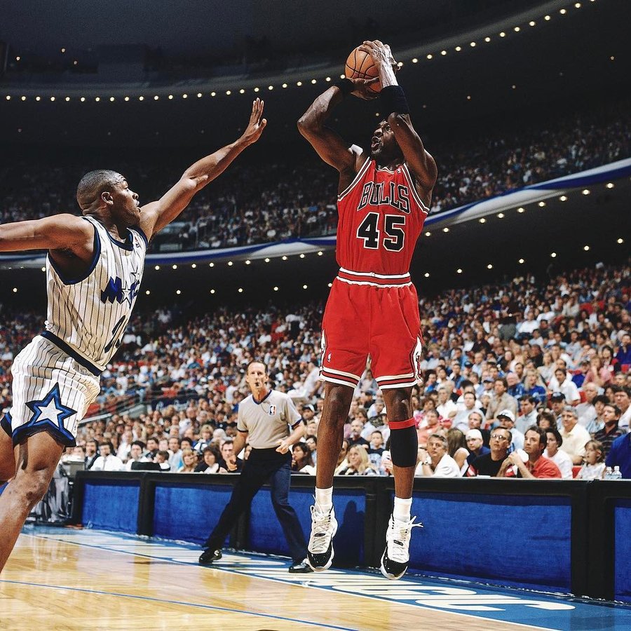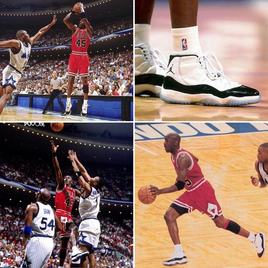 可你们知道吗?在 22 年的今天,在公牛对阵魔术的比赛中,Jordan 身穿 45 号球衣,并上脚 Air Jordan 11 "Concord",这也是经典球鞋中的经典配色首次亮相!