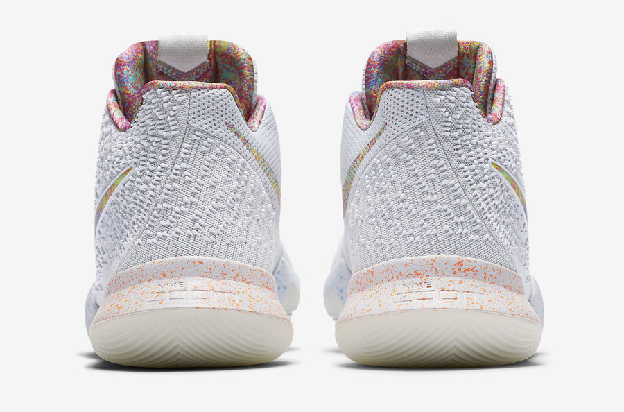这双 Kyrie 3 EYBL 以白色为为整款鞋的主色调,多彩营造的 Nike Swoosh 及绚烂的鞋身内衬,使之格外引人注目!前后分段的泼墨中底也呈现出极富层次的细节表现!整款鞋色彩十分炫彩亮眼,吸睛度十足。