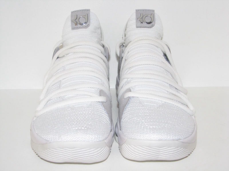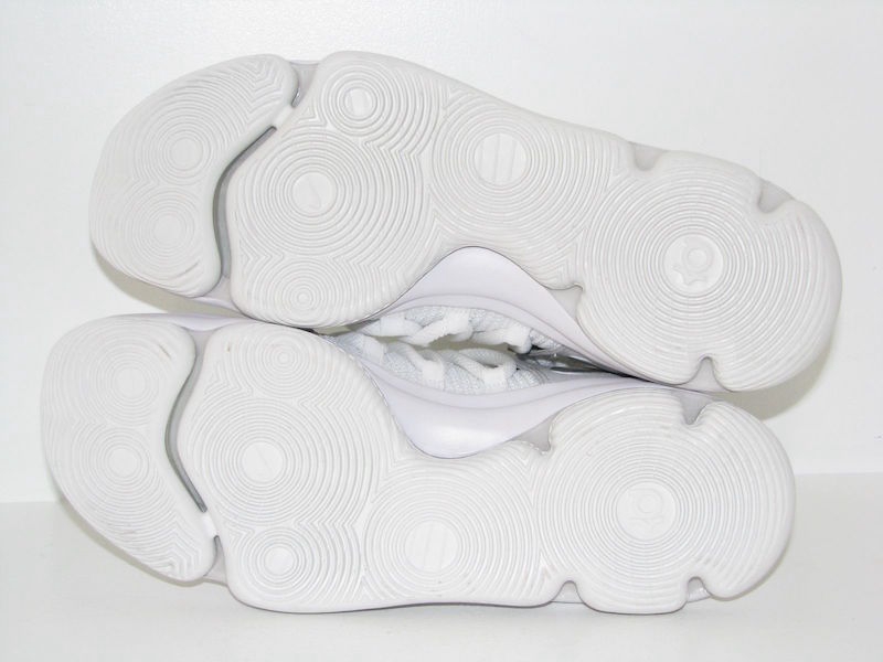 鞋身采用纯白色 Flyknit 编织而成,灰色麂皮材质打造后跟稳定架,Nike Swoosh 与 KD Logo 采用金属质感的银色点缀。与前作明显改进的是,中底上侧就构建的鞋带孔与加粗的鞋带系统,恐怕包裹性可以用变态来形容。多维环状外底纹理也进行了重新设计,最后搭载与前作几乎一致的全掌 Zoom Air,细节上的性能提升还是有目共睹的!