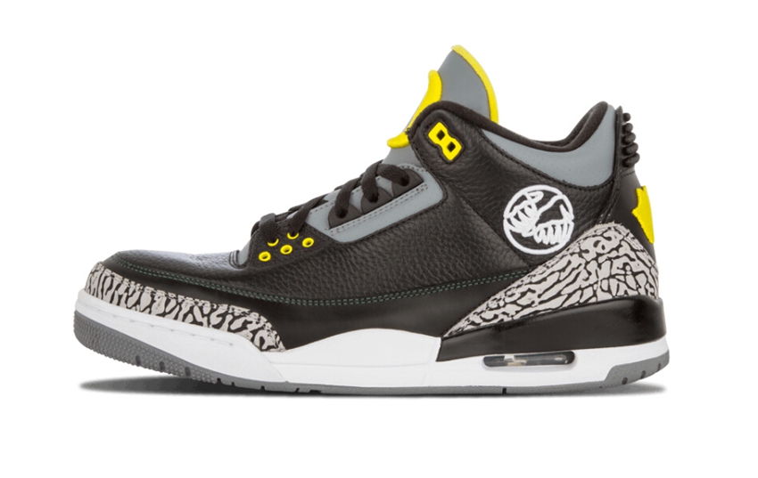 市场上最为稀有的 AJ3 非这双俄勒冈别注的黑水泥配色莫属,鞋舌标志性的字母 O 与鞋帮上的 Pit Crew Logo 表明了它的珍贵稀有身份。