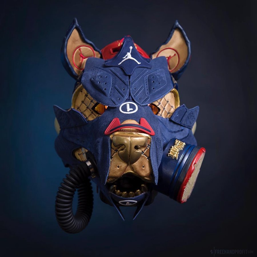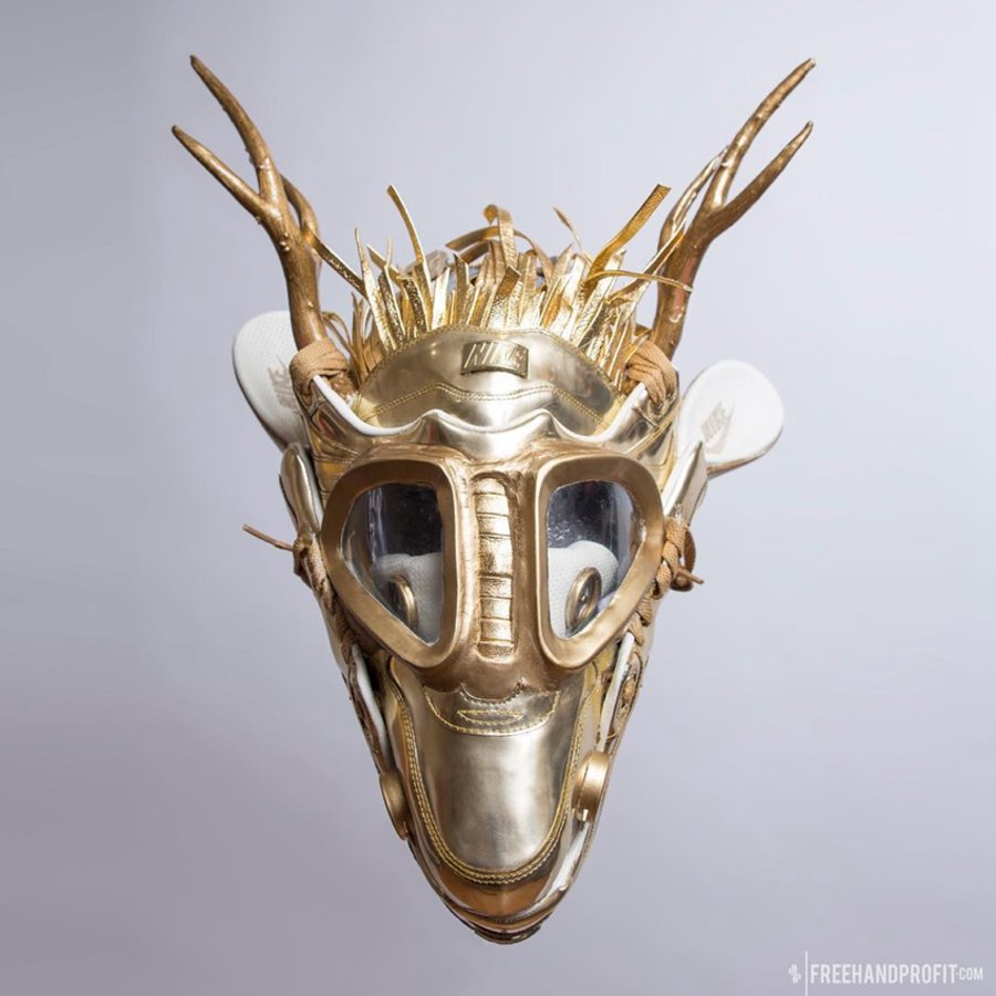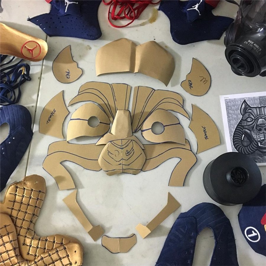 经历了早期的摸索,从开始的 Gucci 女包,发展到如今的球鞋定制,已经制作了超过 100 只球鞋面具。