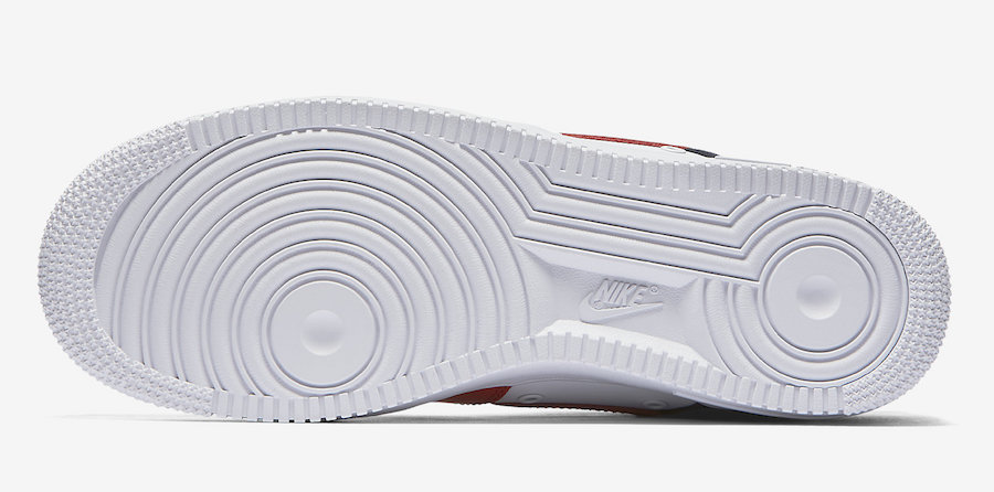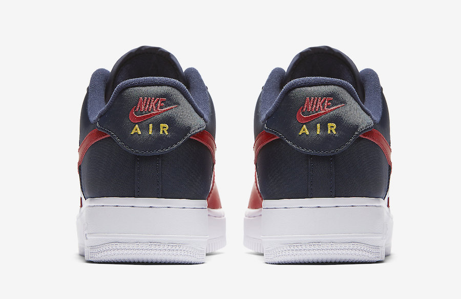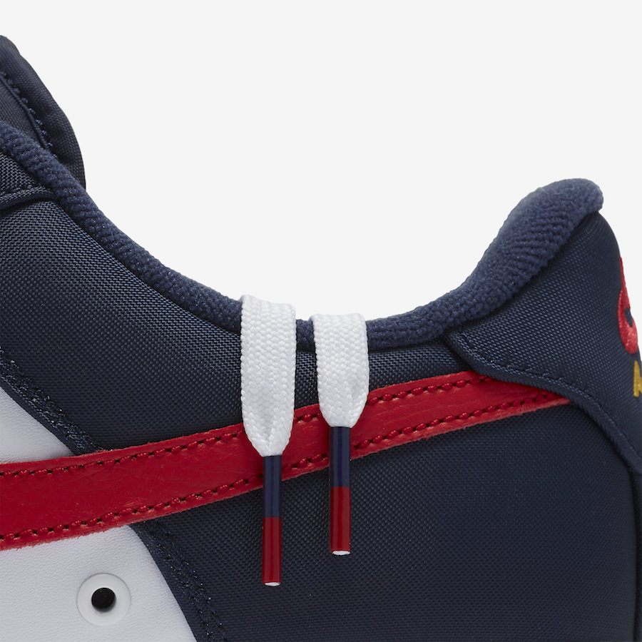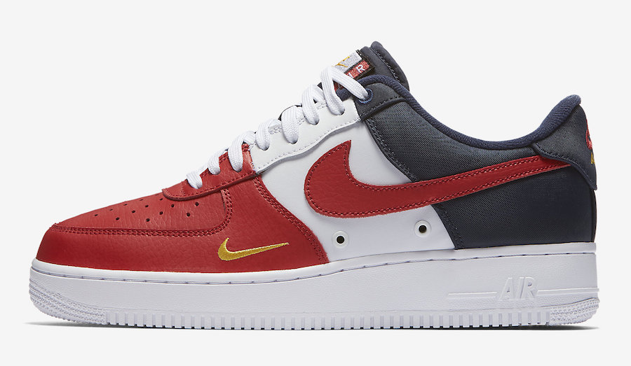 这双 Nike Air Force 1 Low 07 LV8 采用经典的白、红、蓝三色进行搭配,除了鲜艳的红色 Swoosh 之外,鞋头处还绣有金色 Mini Swoosh。