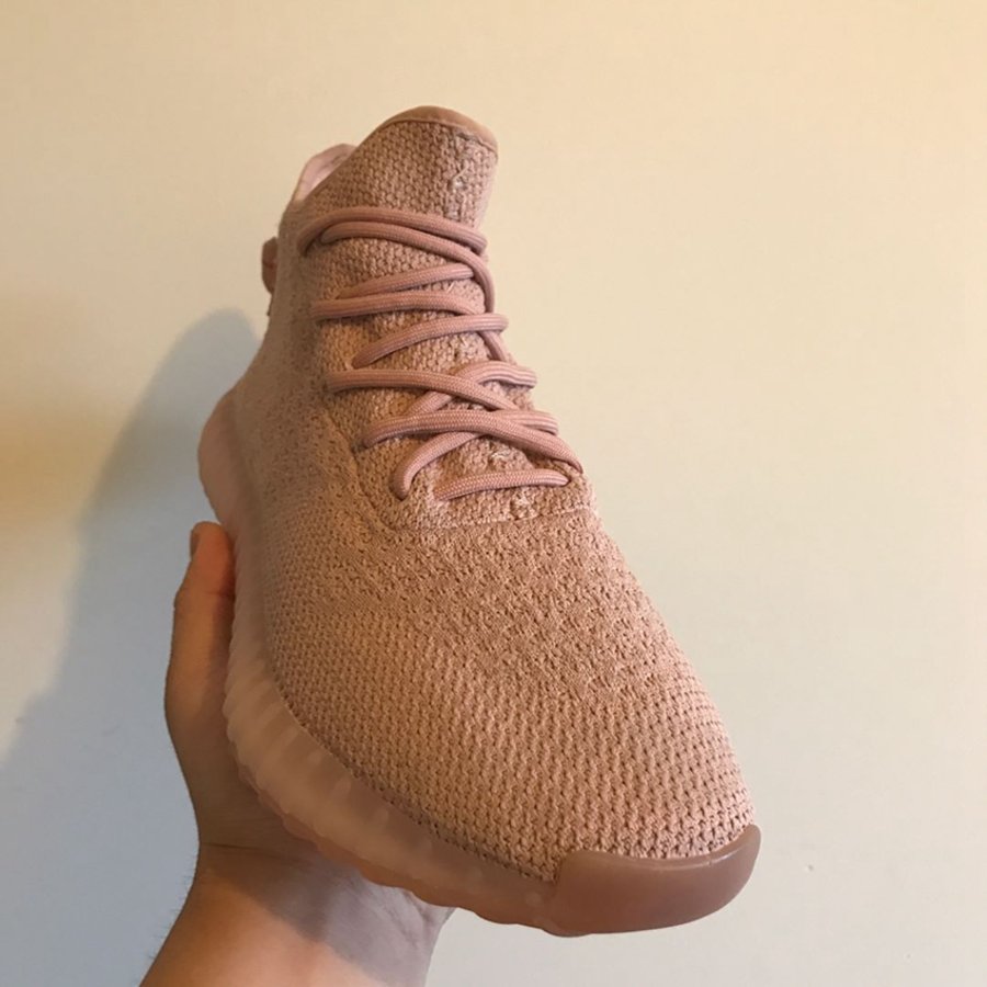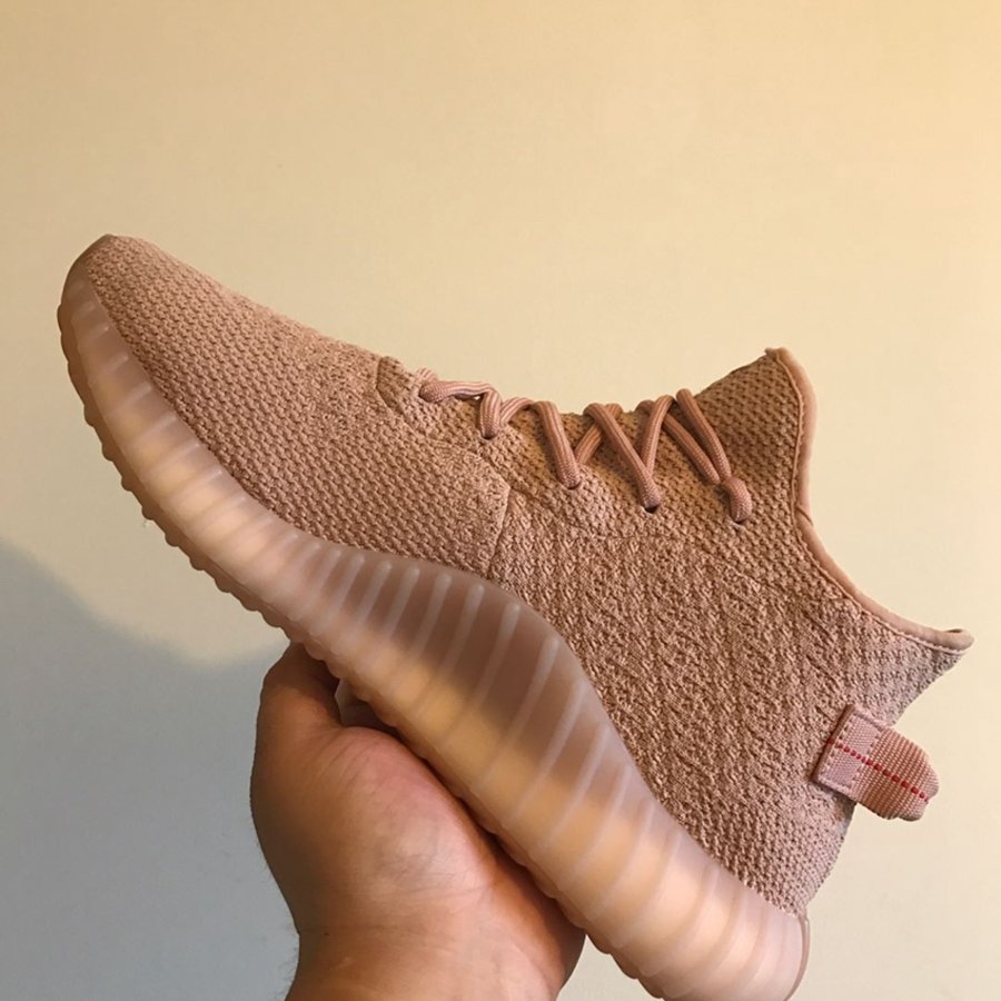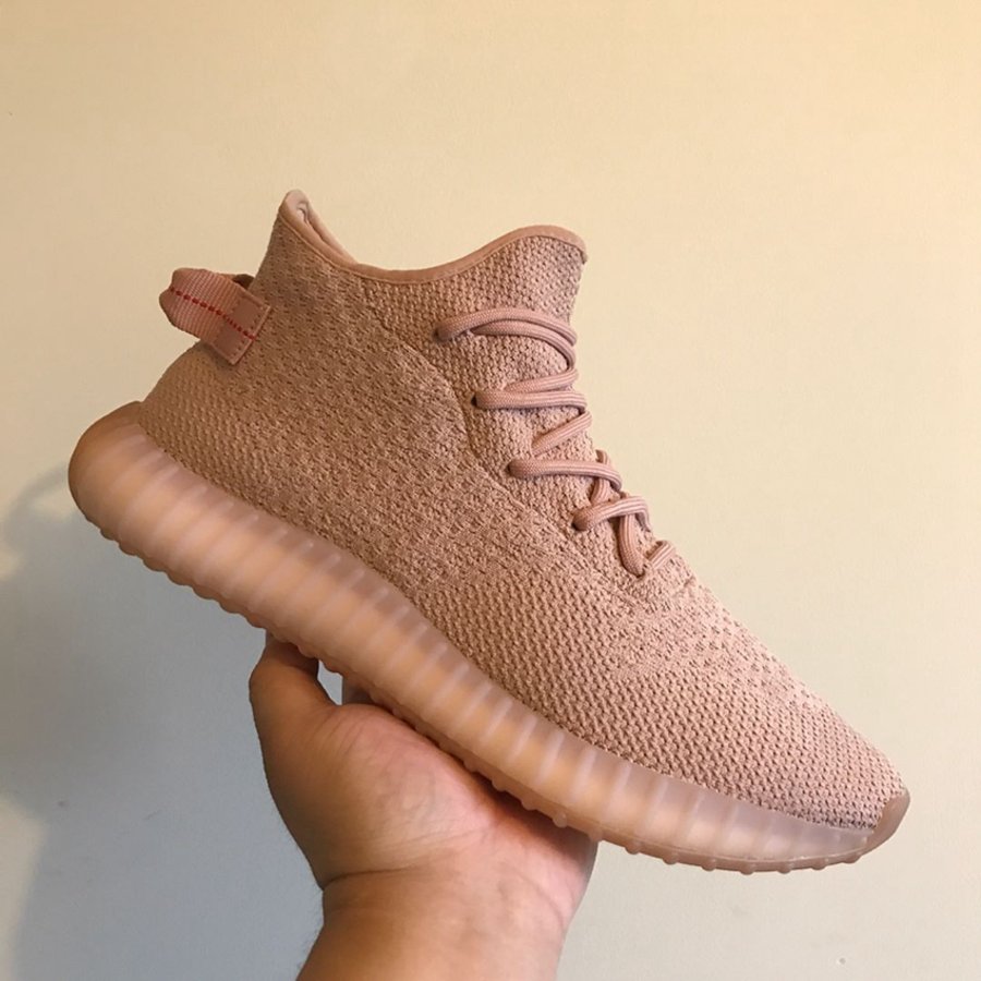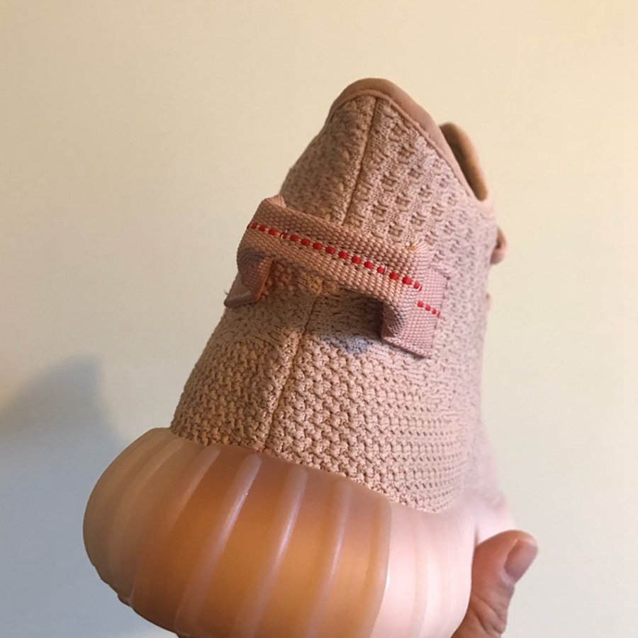 近览该鞋,纯粉 Primeknit 织物并未掺杂任何油漆饰条和字样点缀,整体轮廓更为优雅纯粹。鞋帮高度提升至中帮位置,介于 350 V2 与靴型之间,后跟鞋提与果冻外底则延续近期 Yeezy 350 V2 方案,熟悉的气氛之下又带来耳目一新的简洁与大气。